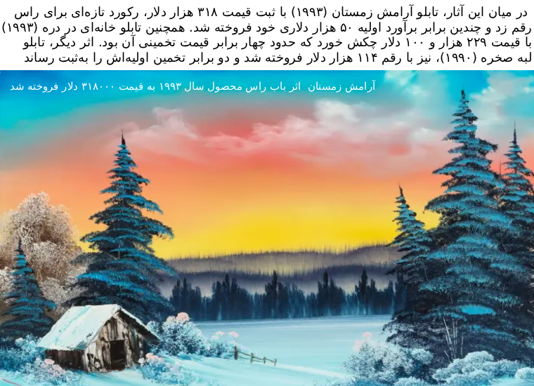 “Winter’s Peace” (1993): A landscape with a snow-capped cabin, frosty evergreens and an idyllic orange sunset, sold for $318,000.