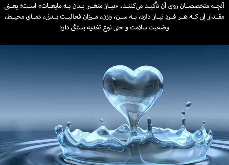 What experts emphasize is the "variable body need for fluids"; that is, the amount of water each person needs depends on age, weight, level of physical activity, ambient temperature, health status, and even type of nutrition.