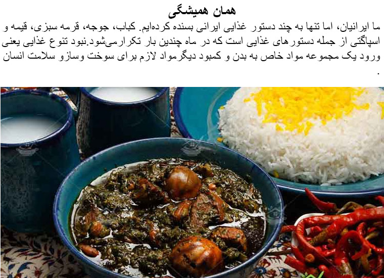 At the end, Iranian serve a meal in a copper containers, this is their custom but they have a reason for do it that. Cooper enters to the food in this way and absorbs their body. Really Iranians eat smartly