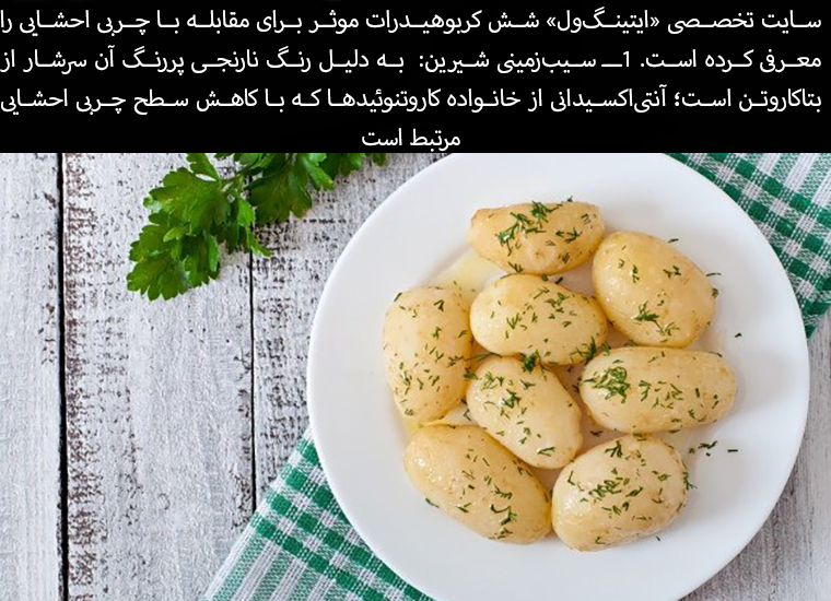 The specialized website Eatingwell has introduced six effective carbohydrates for combating visceral fat. 1- Sweet potato: Due to its deep orange color, it is rich in beta-carotene; an antioxidant from the carotenoid family that is associated with reducing visceral fat levels.