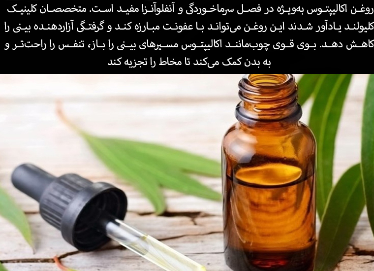 Eucalyptus oil is especially helpful during cold and flu season. Experts at the Cleveland Clinic note that the oil can fight infection and reduce annoying nasal congestion. The strong, woody scent of eucalyptus opens up nasal passages, making breathing easier and helping the body break down mucus.