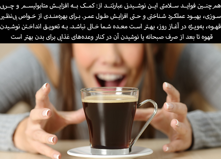 Other health benefits of this drink include helping to increase metabolism and fat burning, improving cognitive function, and even increasing lifespan. To benefit from the unique properties of coffee, especially at the beginning of the day, it is better to drink it on an empty stomach. It is better for the body to postpone drinking coffee until after breakfast or drink it with meals.
