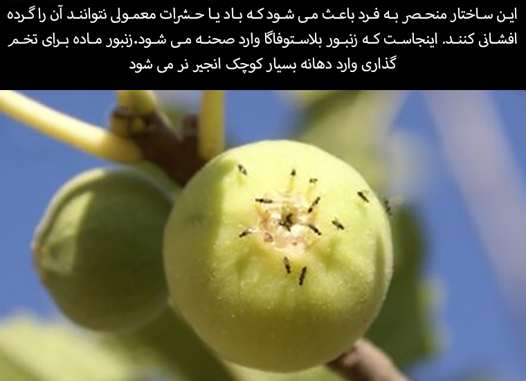 This unique structure prevents it from being pollinated by wind or ordinary insects. This is where the Blastophaga wasp comes in. The female wasp enters the very small opening of the male fig to lay her eggs.