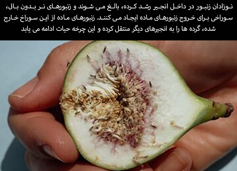 The baby bees grow and mature inside the fig, and the wingless male bees create a hole for the female bees to emerge. The female bees emerge from this hole, transfer the pollen to other figs, and the life cycle continues.