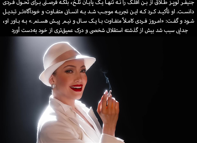 Jennifer Lopez saw her divorce from Ben Affleck not only as a bittersweet ending, but also as an opportunity for personal transformation. She emphasized that the experience made her a different and more self-aware person, saying, "I'm a completely different person today than I was a year and a half ago." She believes that the breakup helped her gain more personal independence and a deeper understanding of herself than before.