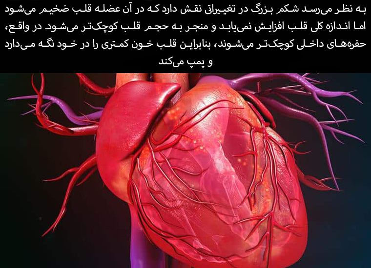 A large belly appears to play a role in changes in which the heart muscle thickens but the overall size of the heart does not increase, resulting in a smaller heart volume. In effect, the internal chambers become smaller, so the heart holds and pumps less blood.