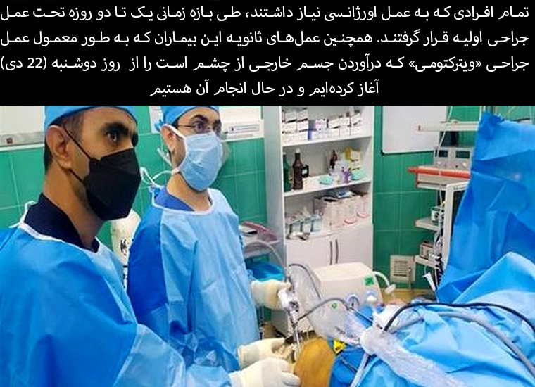 All patients requiring emergency procedures underwent their initial surgeries within one to two days. Secondary surgeries—typically vitrectomy procedures to remove foreign bodies from the eye—began on Monday (January 11 / 22 Dey) and are currently ongoing.