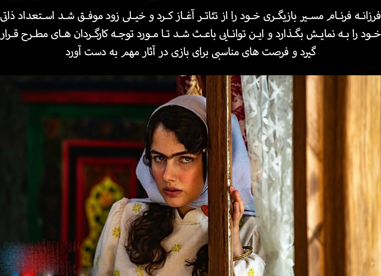 Farzaneh Farnam began her acting career in theater and soon managed to showcase her innate talent, which brought her to the attention of prominent directors and gave her the opportunity to act in important works.