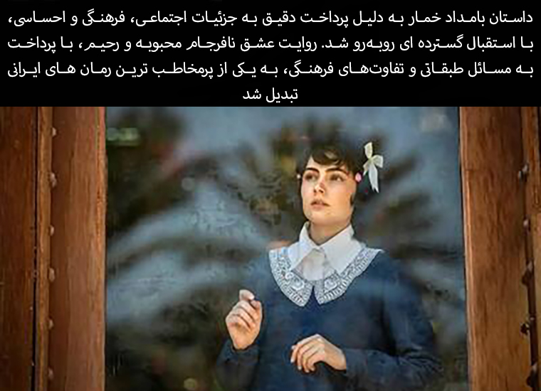 The story of Bamdad Khmar was widely acclaimed for its careful treatment of social, cultural, and emotional details. The story of the unrequited love between Mahboobeh and Rahim, by addressing class issues and cultural differences, became one of the most popular Iranian novels.