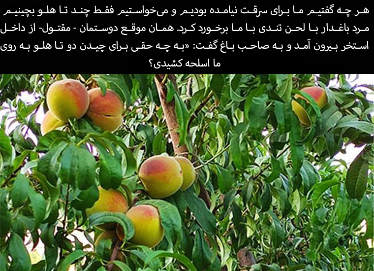 No matter what we said, we weren't here to steal and we just wanted to pick a few peaches, the gardener confronted us with a harsh tone. At that moment, our friend - the victim - came out of the pool and said to the gardener, "What right did you have to pull a gun on us to pick two peaches?"