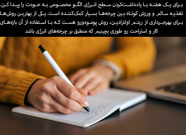 Find your own pattern by keeping track of your energy levels for a week. Eating healthy and exercising in between cycles can help. One of the best ways to tap into your ultradian rhythm is to use the Pomodoro technique, which involves timing your work and rest periods to match your energy cycles.