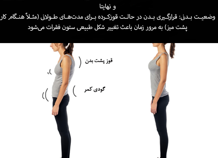 And finally, posture: Being in a hunched position for long periods of time (such as when working at a desk) can change the natural shape of the spine over time.