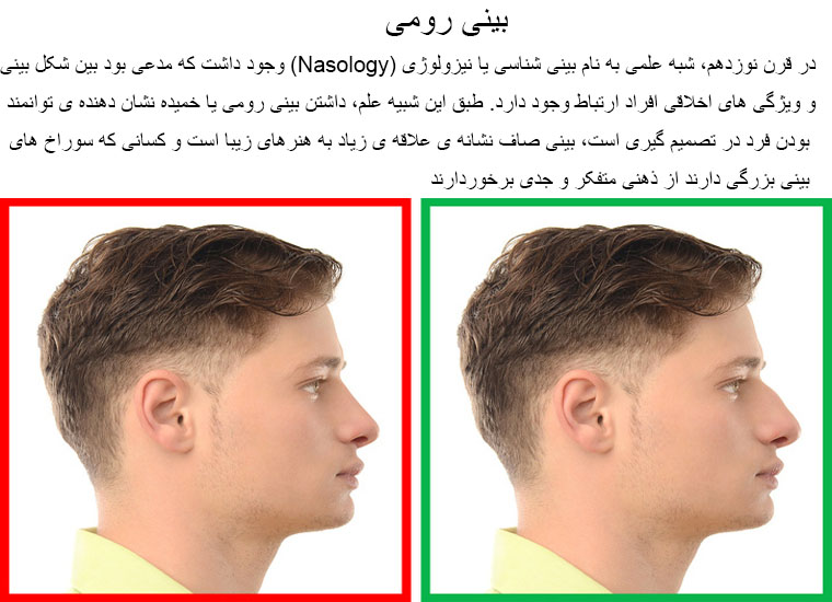 In the nineteenth century, there was pseudoscience called nasology, which claimed that there was a relationship between the shape of the nose and the moral characteristics of individuals. According to this science, the presence of a roman or curved nose indicates the person's ability to make decisions, the smooth nose is a sign of a great interest in fine arts, and those who have large nasal holes have a thoughtful and serious mentality.