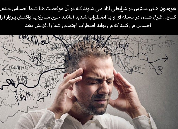 Stress hormones are released in situations where you feel out of control, overwhelmed, or have extreme anxiety (such as during the fight or flight response), which can increase your social anxiety.