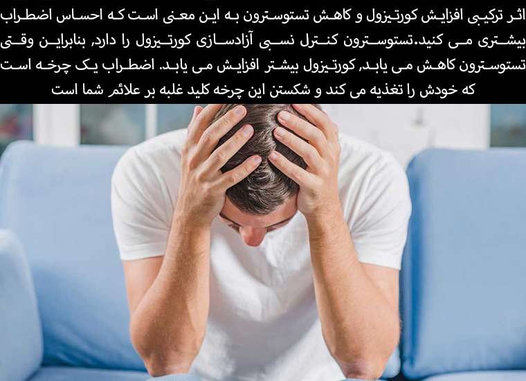 The combined effect of increased cortisol and decreased testosterone means you feel more anxious. Testosterone has a relative control over the release of cortisol, so when testosterone decreases, cortisol increases even more. Anxiety is a cycle that feeds itself, and breaking this cycle is the key to overcoming your symptoms.