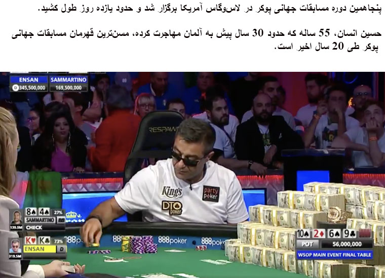 [1] In August 2014, Ensan won the seniors event at the European Poker Tour's Barcelona festival, then a week later finished third out of 1,496 players in the Main Event for €652,000