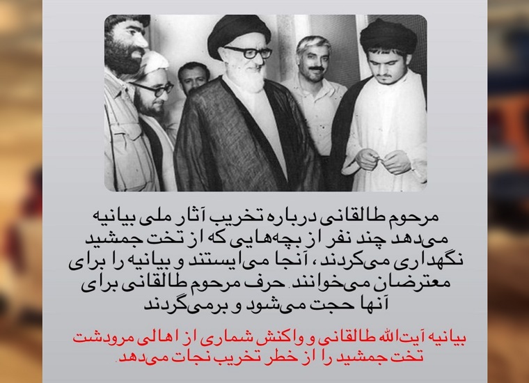 Mehdi Hojat, the founder of the Cultural Heritage Organization, says in this regard: "A number of people with shovels, picks, and hammers boarded three minibusses to destroy Persepolis because they considered it a sign of the empire. The late Taleghani makes a statement about the destruction of national monuments. A few of the Hizbollah children who were taking care of Persepolis stood there and read the statement to the protesters. The words of late Taleghani will be proof for them and they will return."