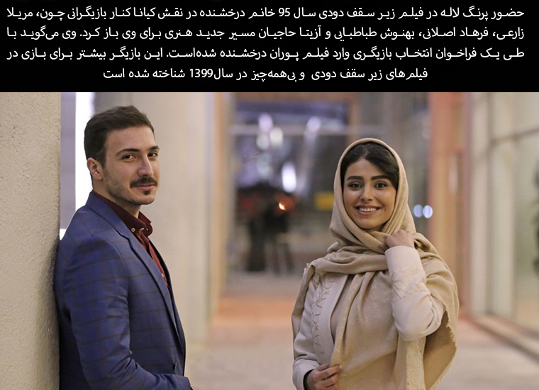 Parang Laleh's appearance in the 2016 film Under a Smoky Roof starring Ms. Derakhshandeh as Kiana alongside actors such as Merila Zarei, Farhad Aslani, Behnoush Tabatabaei, and Azita Hajian opened a new artistic path for her. She says she got into Pouran Derakhshandeh's film through an casting call. This actress is best known for her roles in the 2019 films Under a Smoky Roof and Bihamechiz