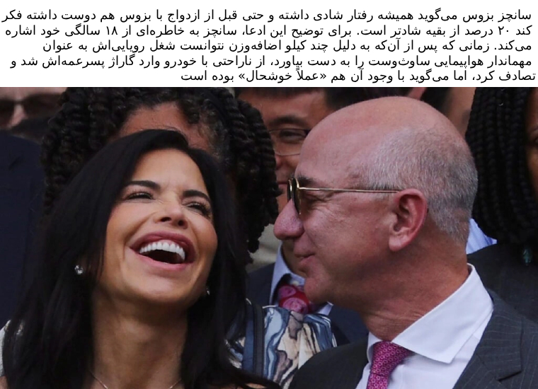 Sanchez-Bezos says she has always had a happy demeanor and, even before she married Bezos, liked to think she was 20 percent happier than everyone else. To illustrate this claim, Sanchez points to a memory from when she was 18. After failing to land her dream job as a flight attendant for Southwest Airlines because she was a few pounds overweight, she crashed her car into her cousin's garage in frustration, but she says she was "practically happy" despite it.