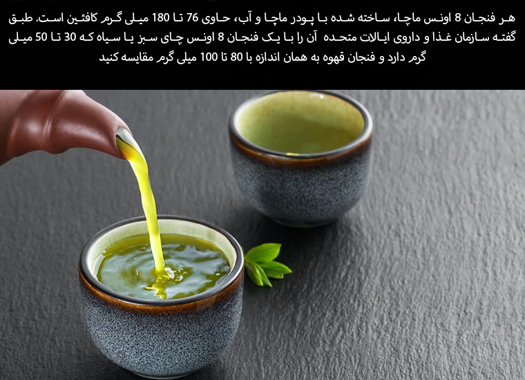 Each 8-ounce cup of Matcha, made with Matcha powder and water, contains 76 to 180 milligrams of caffeine. Compare that to an 8-ounce cup of green or black tea, which has 30 to 50 milligrams, and an equally sized cup of coffee, which has 80 to 100 milligrams, according to the U.S. Food and Drug Administration.