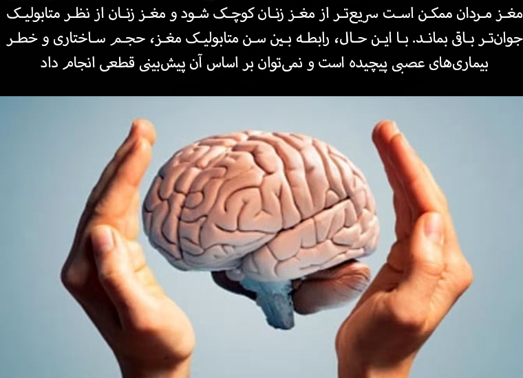 Men's brains may shrink faster than women's brains, and women's brains may remain metabolically younger. However, the relationship between brain metabolic age, structural volume, and risk of neurological disease is complex and cannot be predicted definitively.