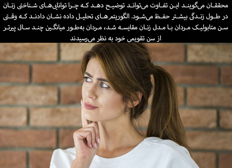 The researchers say this difference could explain why women's cognitive abilities are more likely to be preserved throughout life. Data analysis algorithms showed that when men's metabolic age was compared to women's model, men appeared, on average, a few years older than their chronological age.
