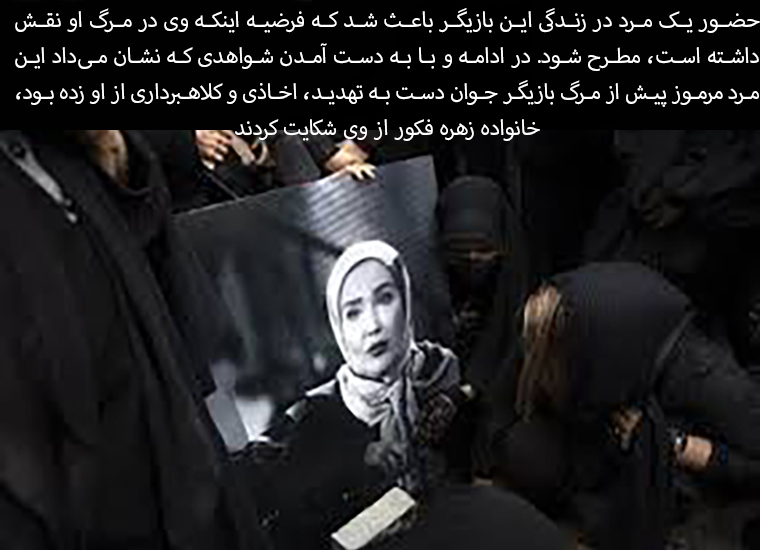 The presence of a man in the actress's life led to speculation that he had a role in her death. Later, with evidence showing that this mysterious man had threatened, extorted, and defrauded the young actress before her death, Zohreh Fakur's family filed a lawsuit against him.