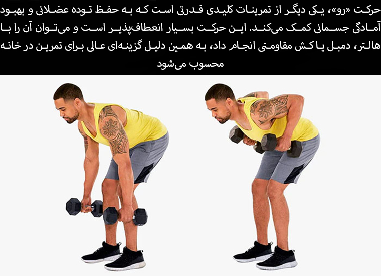 The row is another key strength exercise that helps maintain muscle mass and improve fitness. It's very flexible and can be done with a barbell, dumbbells, or resistance bands, making it a great option for at-home workouts.