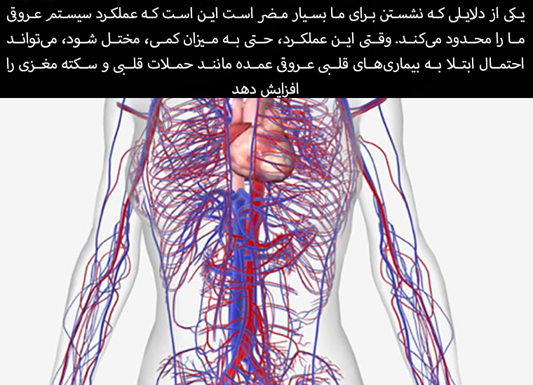 One of the reasons sitting is so bad for us is that it limits the function of our vascular system. When this function is impaired, even slightly, it can increase the risk of major cardiovascular diseases such as heart attacks and strokes.