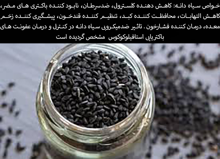 Properties of black seeds: Lowers cholesterol, anti-cancer, destroys harmful bacteria, reduces inflammation, protects the liver, regulates blood sugar, prevents stomach ulcers, treats blood pressure. The antimicrobial effect of black seeds has been shown to control and treat staphylococcus bacterial infections.