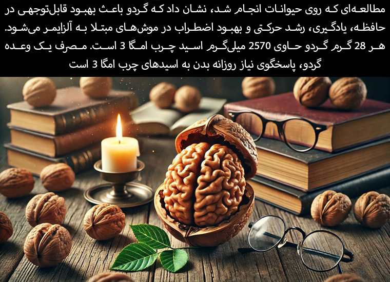 An animal study found that walnuts significantly improved memory, learning, motor development, and anxiety in mice with Alzheimer's disease. Each ounce of walnuts contains 2,570 milligrams of omega-3 fatty acids. One serving of walnuts meets your daily omega-3 requirement.