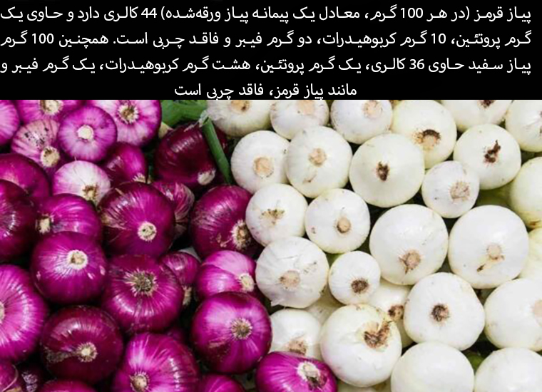 Red onions (per 100 grams, equivalent to one cup of sliced onions) have 44 calories and contain one gram of protein, 10 grams of carbohydrates, two grams of fiber, and no fat. Similarly, 100 grams of white onions contain 36 calories, one gram of protein, eight grams of carbohydrates, one gram of fiber, and, like red onions, no fat.