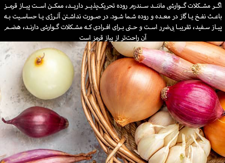 If you have digestive problems, such as irritable bowel syndrome, red onions may cause bloating or gas in your stomach and intestines. If you are not allergic or sensitive to white onions, they are relatively harmless and are even easier to digest than red onions for people with digestive problems.