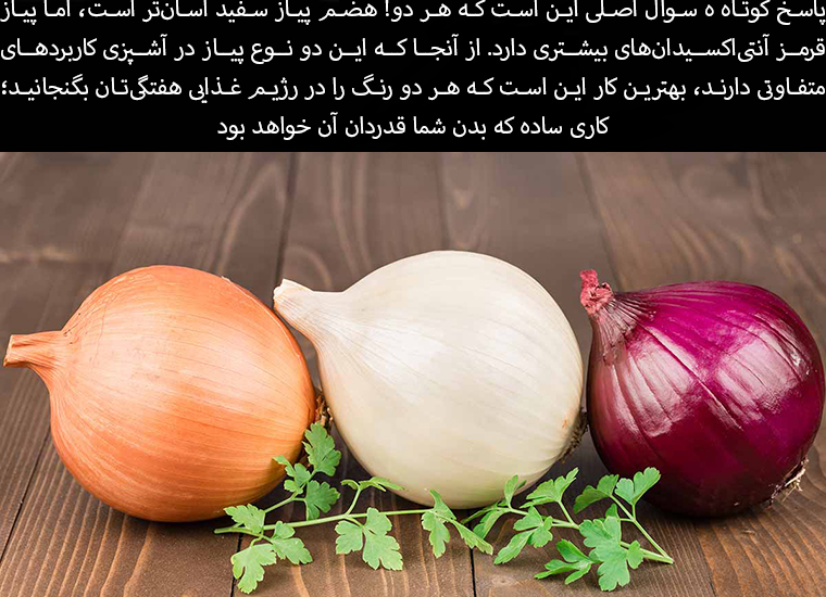 The short answer to the original question is both! White onions are easier to digest, but red onions have more antioxidants. Since the two types of onions have different culinary uses, it's best to include both colors in your weekly diet; a simple thing that your body will appreciate.