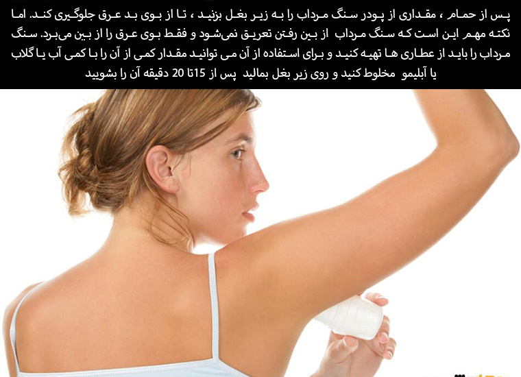 After bathing, apply some of the PBO powder to your armpits to prevent bad sweat odor. But the important thing is that PBO does not eliminate sweating and only eliminates the smell of sweat. PBO should be obtained from apothecaries and to use it, you can mix a small amount of it with a little water or rose water or lemon juice and apply it to your armpits. Wash it off after 15 to 20 minutes.