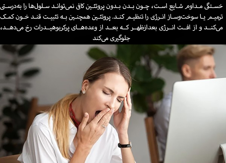 Constant fatigue is common because the body cannot properly repair cells or regulate energy metabolism without enough protein. Protein also helps stabilize blood sugar and prevent the afternoon energy crash that occurs after high-carb meals.