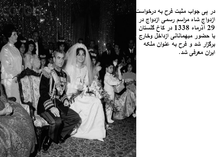 Following the positive response of Farah to the request of the king's marriage, the official marriage ceremony was held on December 29, 1338 at Golestan Palace with guests from inside and outside Iran, and Farah was introduced as the Queen of Iran.
