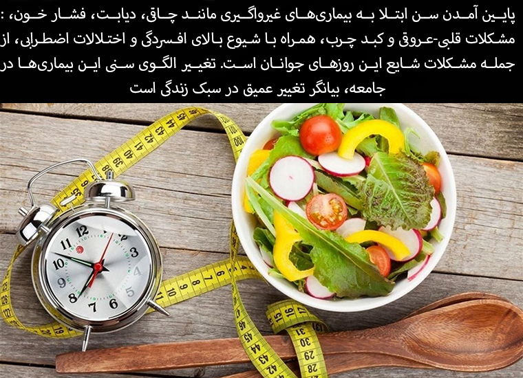 The decreasing age of onset of non-communicable diseases such as obesity, diabetes, blood pressure, cardiovascular problems and fatty liver, along with the high prevalence of depression and anxiety disorders, are among the common problems of young people these days. The changing age pattern of these diseases in society reflects a profound change in lifestyle.