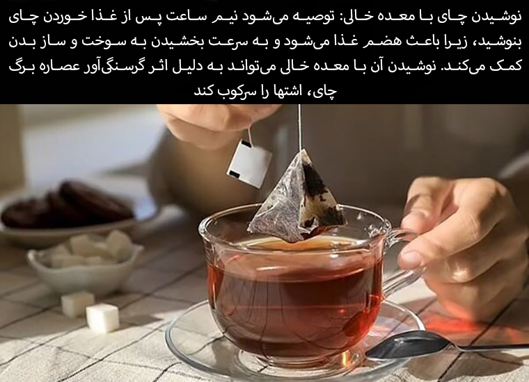 Drinking tea on an empty stomach: It is recommended to drink tea half an hour after eating as it aids digestion and helps speed up metabolism. Drinking it on an empty stomach can suppress appetite due to the satiating effect of tea leaf extract.