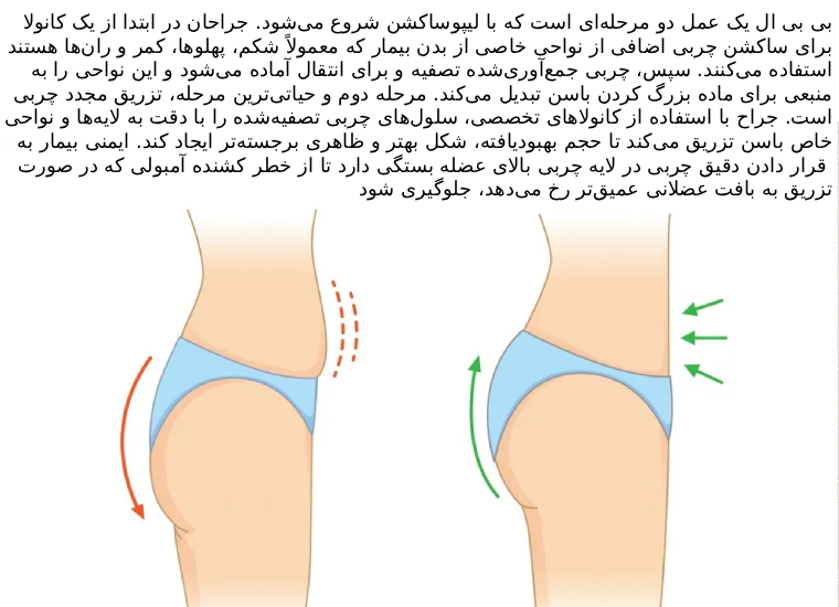 The BBL is a two-part procedure that begins with liposuction. Surgeons first use a cannula to strategically suction excess fat from donor sites on the patient's body, typically the abdomen, flanks, lower back and thighs.