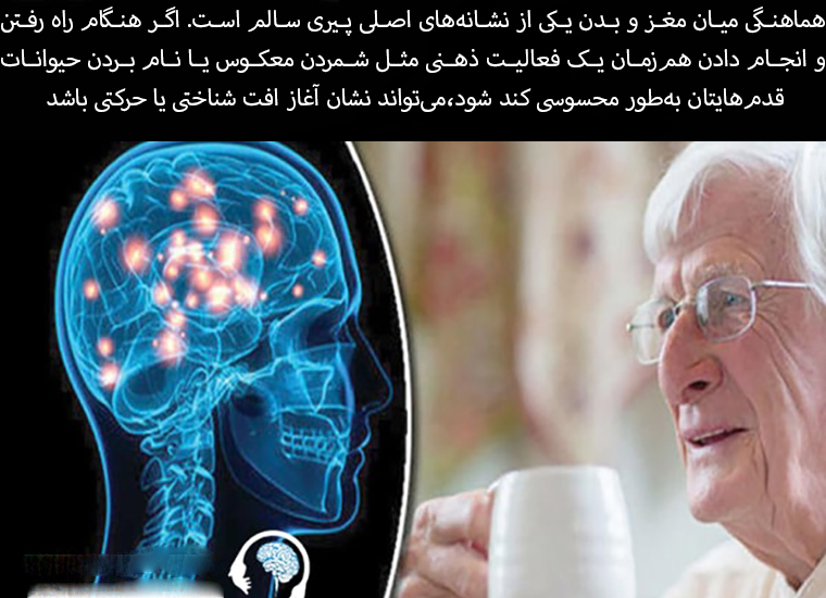 Brain-body coordination is a key sign of healthy aging. If your steps noticeably slow down while walking and simultaneously performing a mental activity, such as counting backwards or naming animals, it could be a sign of the beginnings of cognitive or motor decline.