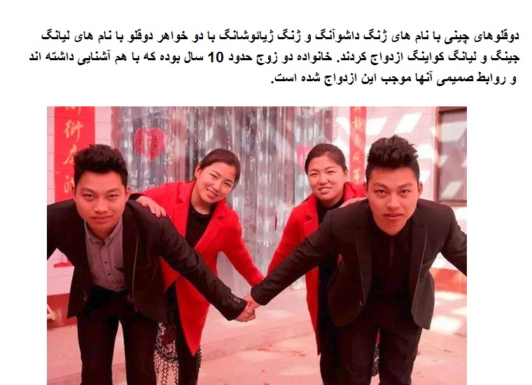 Twin sisters who married twin brothers. Chinese twin brothers Zheng Dashuang and Zheng Xiaoshang were married to twin sisters Yang Jing and Liang Quaing in 2017 in the Docking District of China's Heilongjiang Province. Previous Next Pages: 1 2 3 4 5 6 7 8 9 10 Marriage of twins married similarities twin brothers twin sisters 2020-09-24 admin