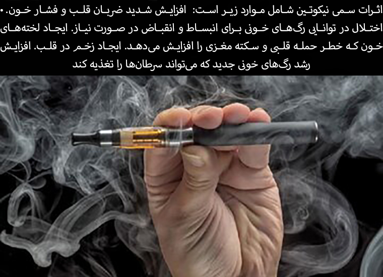 Nicotine's toxic effects include: Severe increases in heart rate and blood pressure. Impairment of the ability of blood vessels to expand and contract as needed. Formation of blood clots, which increases the risk of heart attack and stroke. Formation of scars in the heart. Increased growth of new blood vessels that can feed cancers.