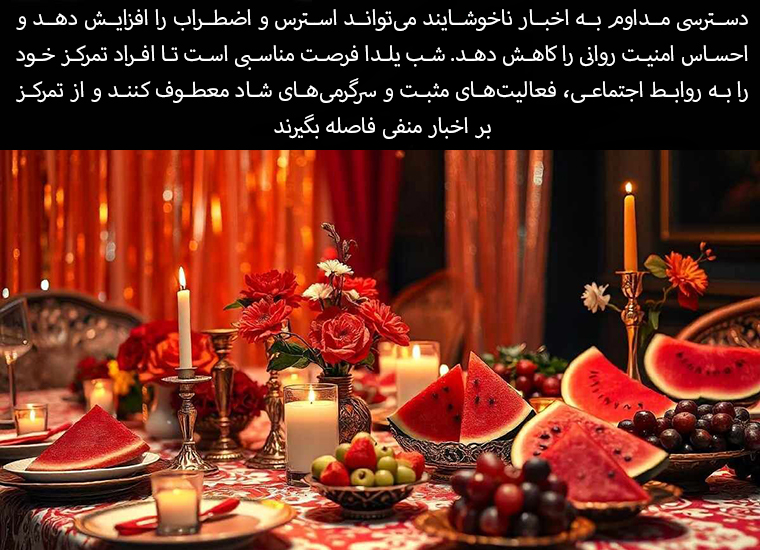 Constant access to unpleasant news can increase stress and anxiety and reduce feelings of psychological security. Yalda Night is a good opportunity for people to focus on social relationships, positive activities, and happy hobbies and distance themselves from focusing on negative news.
